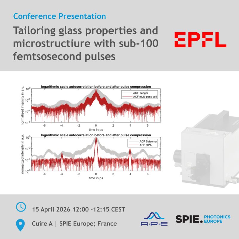 April 10th, 2026On April 15th, EPFL will give a talk on “tailoring glass properties and microstructure with sub-100 femtosecond pulses”.