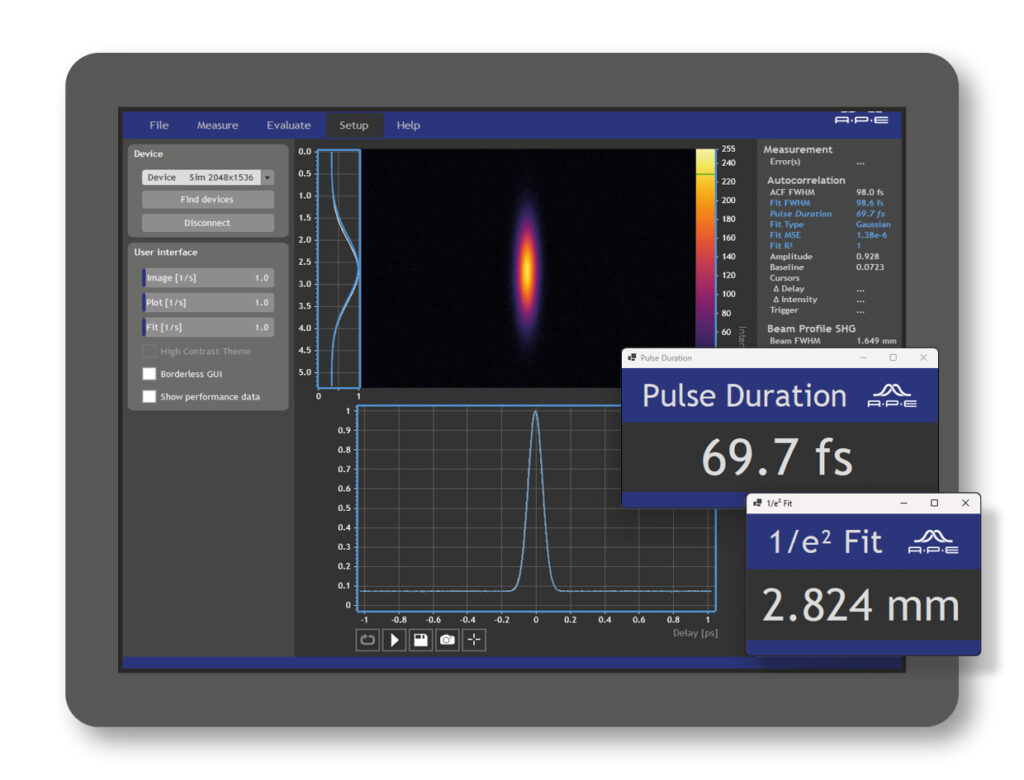 The pulseCheck Single completes APE’s portfolio of autocorrelators by featuring single-shot measurements of ultra-short, low repetition rate laser amplifiers, as well as the capability to measure high repetition rate laser. Single-shot measurements of for example Ti:sapphiere-based or Ytterbium-based, kHz amplifier systems is no issue. This comprehensive insight makes the pulseCheck Single an indispensable tool for fine-tuning ultrafast lasers, particularly during adjustments like grating alignments or compressor tweaks.