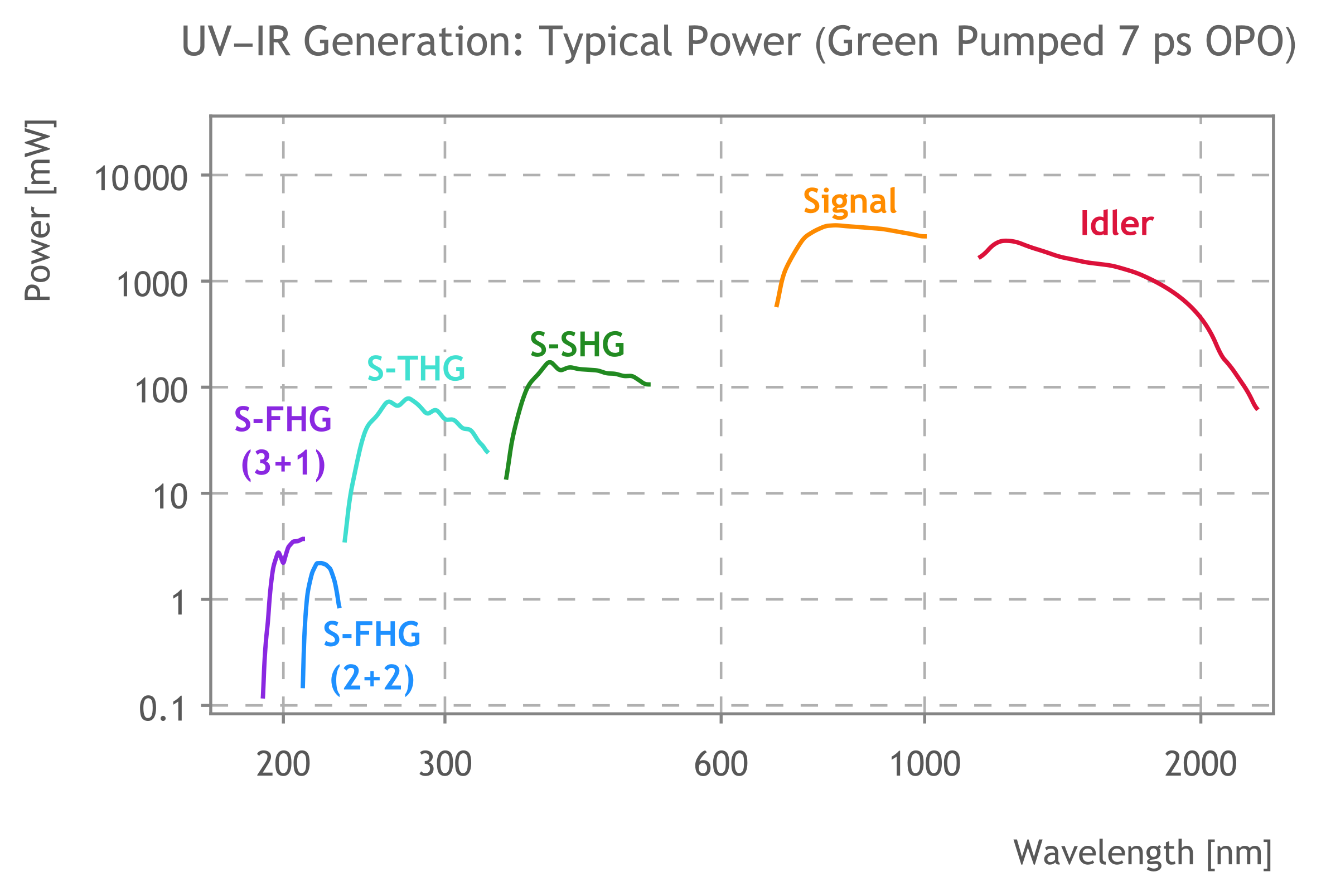 | Power | 1 mW at 200 nm | 1 mW at 220 nm | 40 mW at 267 nm | 120 mW at 400 nm | 2.5 W at 800 nm | 1.7 W at 1250 nm |