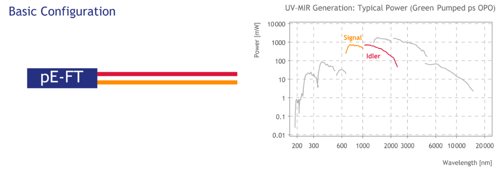Systems can be further customized using pulse pickers (pulseSelect) to reduce the repetition rate, spectral slicers (pulseSlicer) for bandwidth reduction and optical delay lines (scanDelay). A picoEmerald FT can also be used to pump a second OPO, generating independent, tunable, and synchronized pulses.
